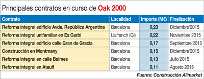 La constructora barcelonesa Oak 2000 , especializada en la rehabilitación y reformas de inmuebles, está ejecutando una cartera de obra que ronda el millón de euros hasta final de año. El grueso de sus contratos se localizan en Barcelona, siendo la mayoría contratos para la reforma de inmuebles. Entre éstos, destaca la reforma integral de un edificio en la Avenida República Argentina de la Ciudad Condal, que finalizará en diciembre; la reforma integral de una vivienda unifamiliar en Es Garbi, en la localidad gerundense de Llafranch, que estará lista en noviembre; y la reforma integral de un edificio en la calle Gracia de Barcelona.
